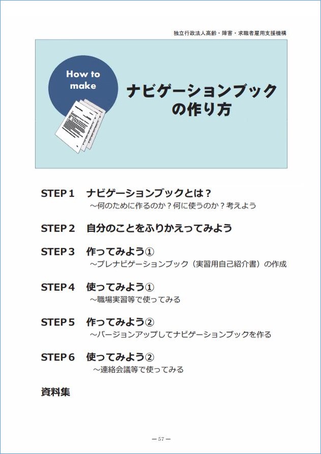 発達障害のある方が就職活動や職場定着を円滑に進めるためのツールとして開発した「ナビゲーションブック」の作成と活用について、その具体的方法を取りまとめたものです。