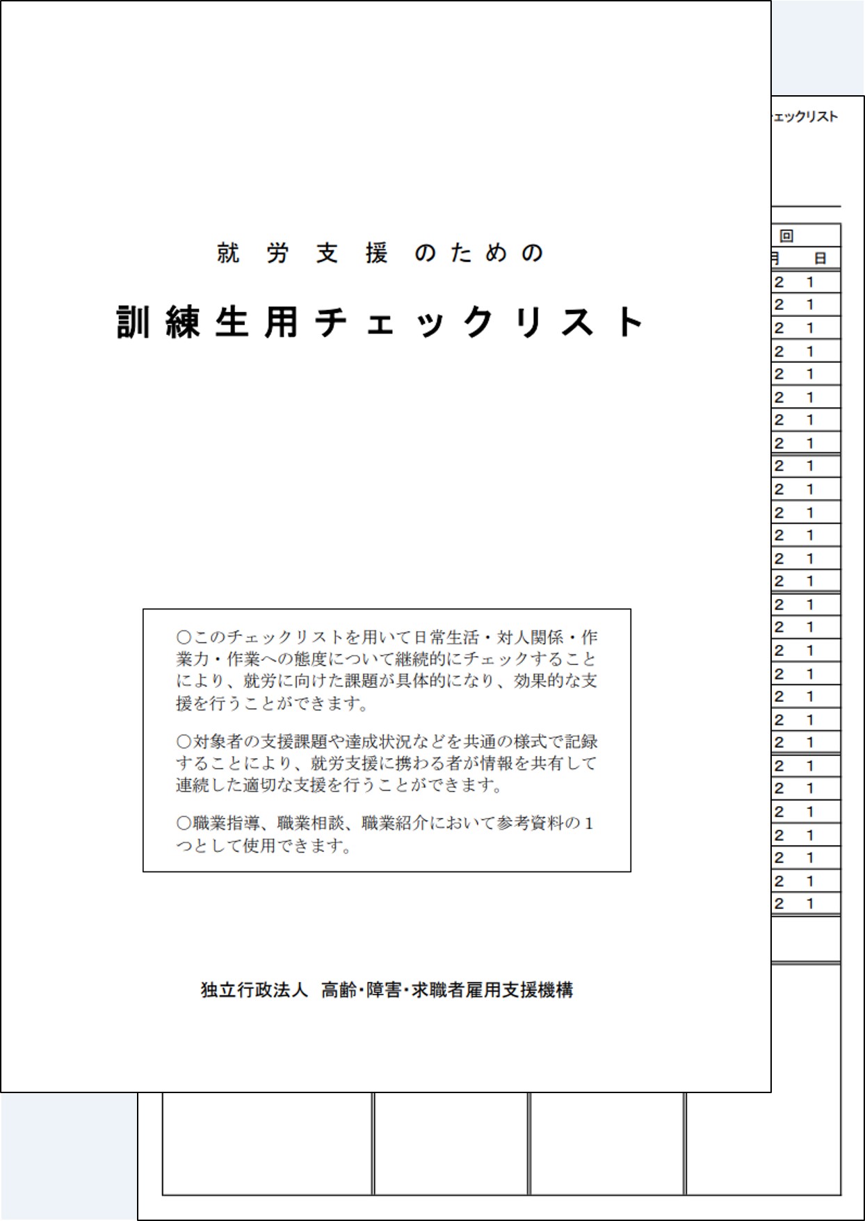 教育、訓練、福祉等の機関や事業所が連携して連続した就労支援を円滑に行えるよう、関係者が共通して使用することができる2種類のチェックリストです。1つ目は、就労前の教育・訓練場面において活用する「就労支援のための訓練生用チェックリスト」、2つ目は、就労後の雇用管理・人材育成場面において活用する「就労支援のための従業員用チェックリスト」です。