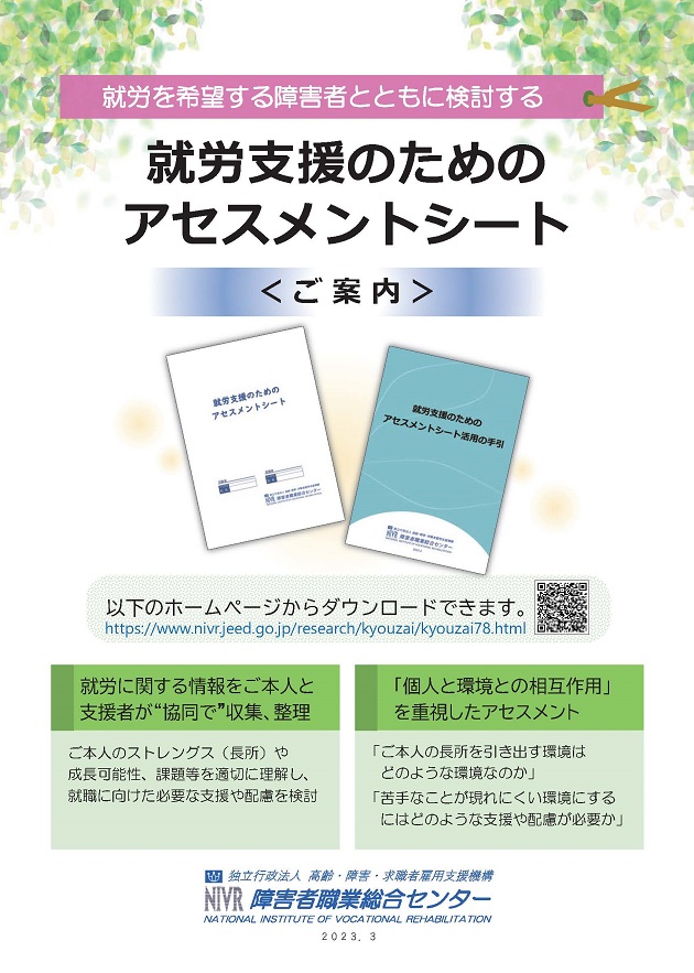 「就労支援のためのアセスメントシート」は、支援者が就労を希望する障害者ご本人とともに、就労に関する情報(希望やニーズ、ストレングス(強み)や課題、必要な支援や配慮)を収集、整理することができます。シートのダウンロードは「就労支援のためのアセスメントシート活用の手引」ページから行えます。