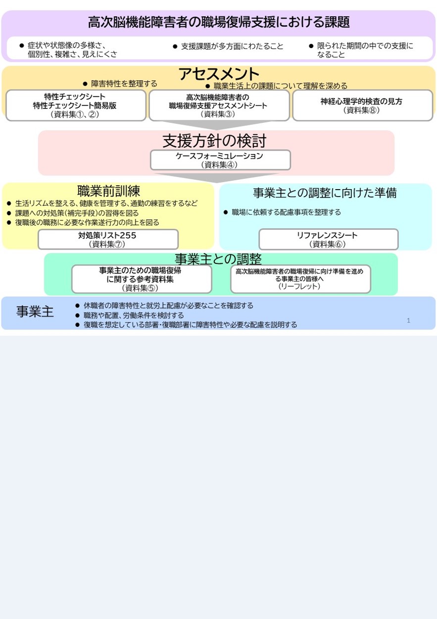 高次脳機能障害者の職場復帰支援を進める際、特に事業主との調整方法を検討する際にお役立て下さい。 |
