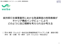 就労移行支援事業所において、サビカス博士の「キャリア構成インタビュー」を実施した際、どのように自己理解が変化するか検証する。またウェルビーの発達障害支援専門センターとしての取り組み(①MWS(ワークサンプル幕張版)、②発達専門アセスメントシート、③他者理解ワーク)など既存の取り組みも取り上げる。これらの取り組みが、「就労選択支援」においてどのように役立てられるかも論じたい。