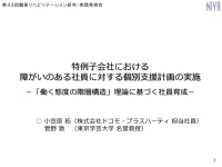 菅野(2015)は障がい者が働き続け、社会的な自立をするために「働く態度」の醸成が重要であると指摘している。当社では「働く態度の階層構造」理論(菅野2015)をもとにした、社員個々の育成評価とそれに応じた体系的な育成・支援計画を導入している。本発表では障がいのある社員の育成・支援の実践と課題について報告をおこなう。