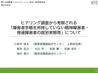 障害者職業総合センターでは、2024年度から2025年度にかけ、精神障害又は発達障害を有して診断を受けているが障害者手帳を所持していない者に対する就労支援機関における効果的な支援方法や課題への対処等の検討に資することを目的に「障害者手帳を所持していない精神障害者、発達障害者の就労実態等に関する調査研究」を行っている。本発表はヒアリング調査から把握した就労実態等について取りまとめた結果を報告する。