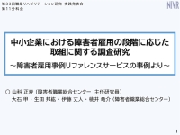 中小企業における障害者雇用の促進や、支援機関による事業主支援等の参考に資することを目的にして、現在、当機構ホームページの障害者雇用リファレンスサービスに登録されている中小企業の障害者雇用事例の中から、①雇用を進める時の相談相手や相談方法、②社内理解の促進方法、③業務見直しの方法に関して記載されている内容を再分析して、その集計結果、分析結果を報告する。