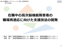 障害者職業総合センター職業センターでは、高次脳機能障害者に対する就職、復職等に向けた支援技法の開発に取り組んでいる。さらに、令和6年度から、現に職場で就業中の者のうち、高次脳機能障害による職務遂行上の問題等から職場適応に課題が生じているケースへの対応のため、これまで開発した相談支援ツールの適用や改良等の技法開発を行っており、本発表において、本開発の意義、経過等について報告する。