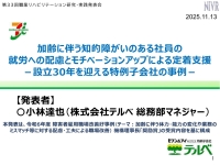 設立30年を迎えた特例子会社では、設立時に20代後半で採用した知的障がいのある社員が50代半ばを迎え、加齢に伴う身体機能の低下、通院頻度の増加による欠勤日数の増加、記憶力や判断力の低下が発生し、仕事の幅も減り、モチベーションの低下が発生。その中で、個人の体調と能力を最大限に発揮させ、他部門への応援やほめる評価を実施。また、会社全体での管理職全員への配慮事項の共有等を通して対応を重ねた事例を報告。