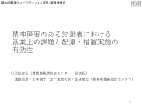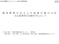 本発表は、調査研究報告書№182「精神障害者の等級・疾患と就業状況との関連に関する調査研究」の第2章から得られた知見をもとに、現在の事業所に就職を決めた理由や前の仕事を辞めた理由、前の事業所にどのような配慮・措置があれば、仕事を続けていたと思うか、現在の職場で受けている配慮・措置の中で役に立っている配慮・措置等の変数を用いて精神障害者の就業行動について主な疾患別に比較検討する報告である。
