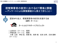 近年のICT技術の進化により、視覚障害者の就労環境は大きく変化してきた。スクリーンリーダー(画面読み上げソフト)などの支援ソフトや支援機器の活用により視覚障害者の職域は、着実に拡大している、一方で、こうした実態は一般に知られておらず、職場環境のアクセシビリティ不足などまだまだ課題も多い。本発表ではタートルICTサポートプロジェクトで実施したアンケート調査を分析し、その実態と課題を明らかにする。